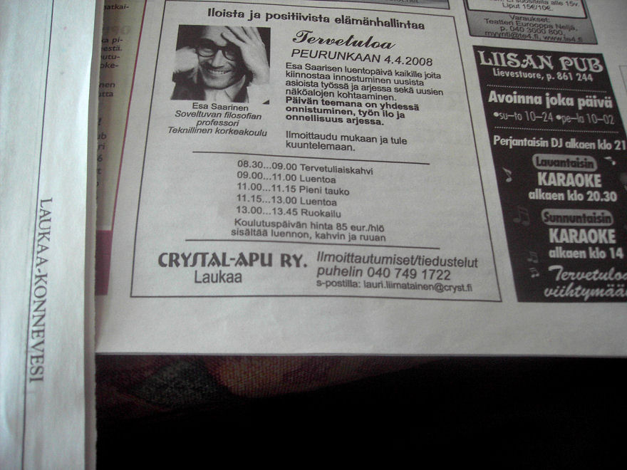 | 2008-03-27 "Esa Saarinen soveltuvan filosofian professori". Ilmoitus Laukaa-Konnevesi-lehdessä tänään torstaina 2008-03-27. "Iloista ja positiivista elämänhallintaa. Tervetuloa Peurunkaan 4.4.2008. Esa Saarisen luentopäivä kaikille joita kiinnostaa innostuminen uusista asioista ..." Kuva: Pertti Manninen. |